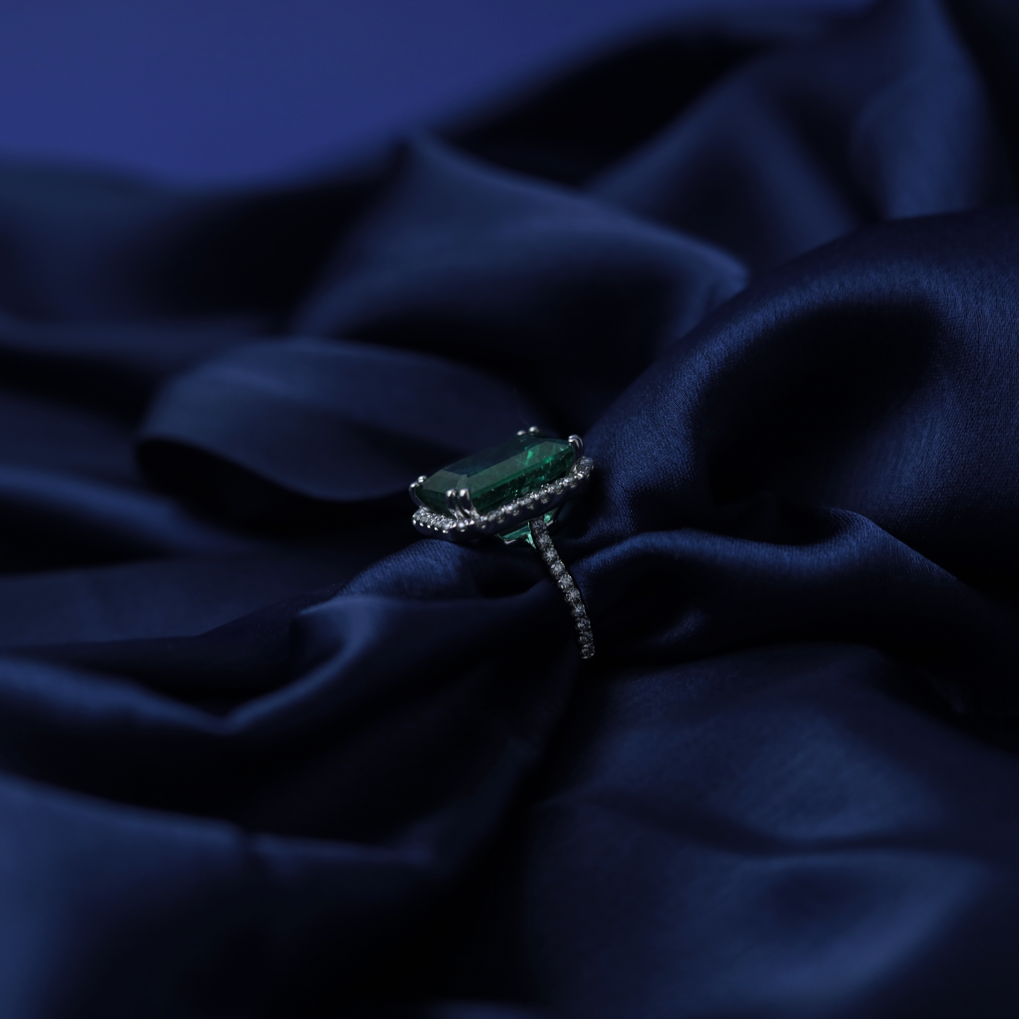 Emerald-cut centerpiece with bold clarity and vibrant green tone