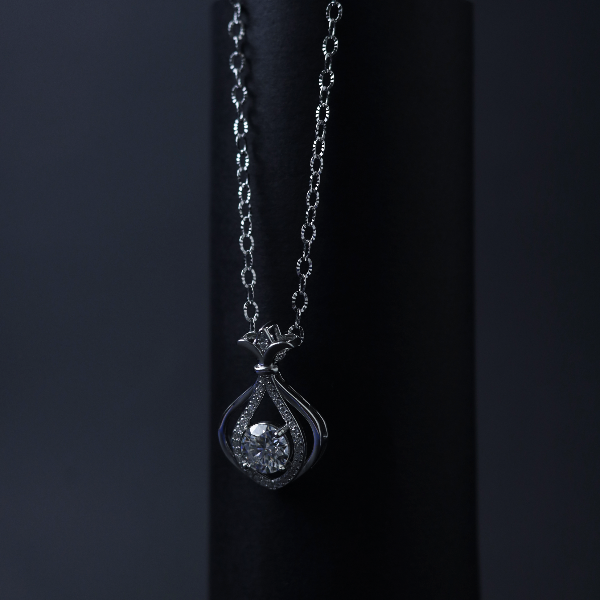 At the heart of the pendant lies a brilliant round-cut moissanite, cradled within two teardrop arcs lined with shimmering stones. The crown-inspired bail adds a regal flourish, giving the piece an elevated, luxurious look. Perfect for daily sophistication or evening refinement, this pendant shines effortlessly with every occasion.