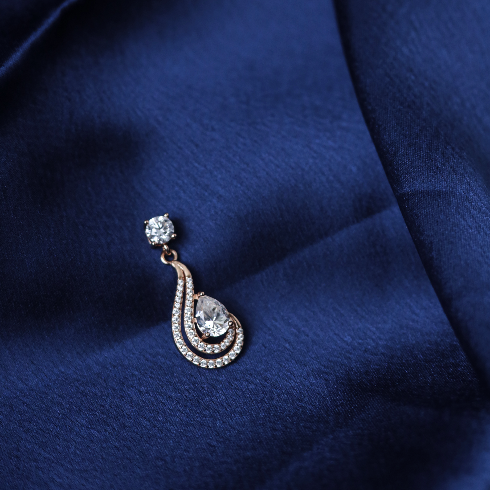The pendant features a sweeping teardrop silhouette resembling a swan,s gentle curve, accentuated by a radiant pear-cut moissanite at its centre. Twin arcs of shimmering stones gracefully outline the form, creating an illusion of motion and effortless charm. The matching earrings mirror this elegant motif, making the set perfect for bridal wear, festive celebrations, and elegant evenings.