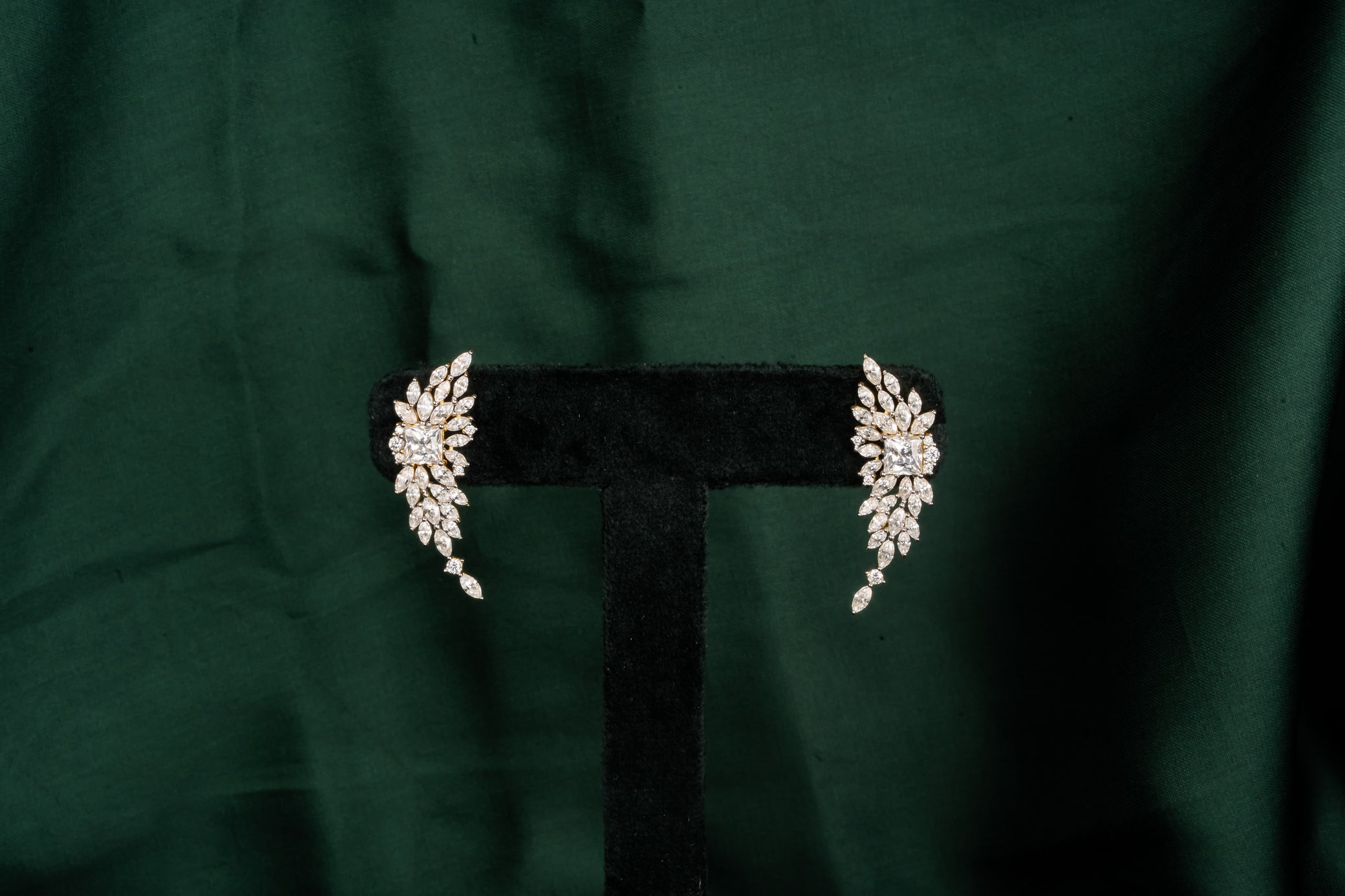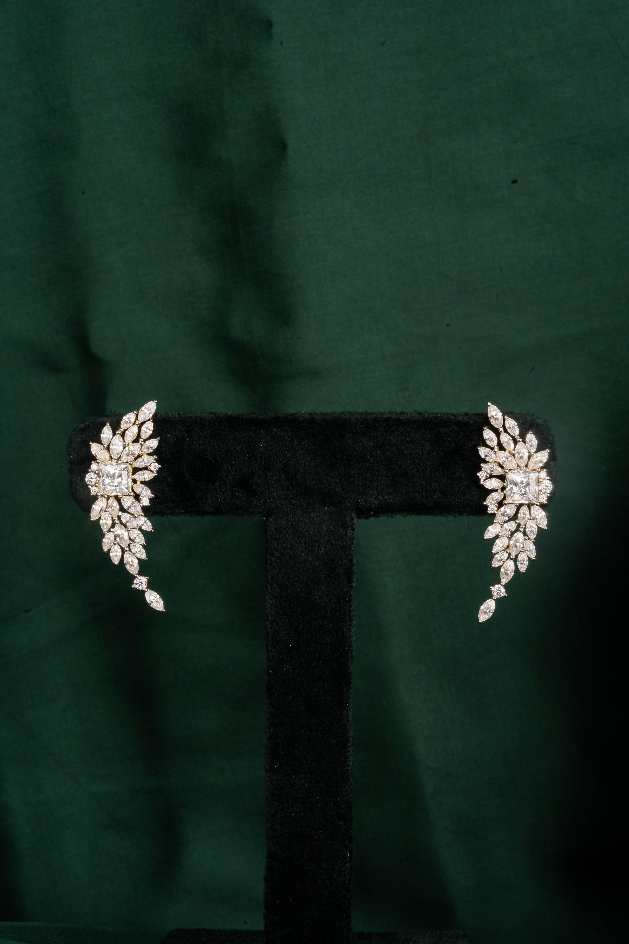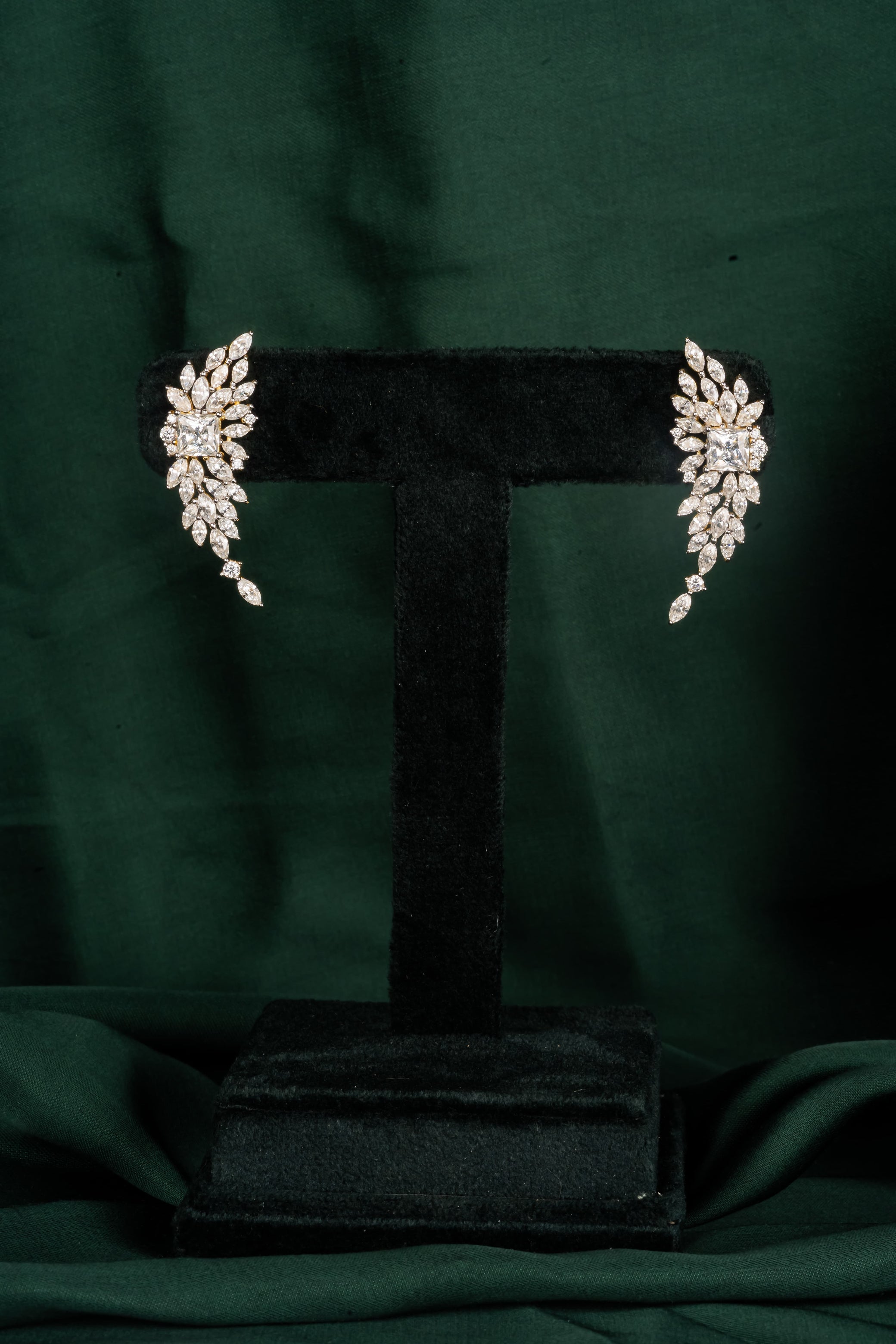 Marquise-cut stones arranged like leaves catching light as they fall: each one set at a slightly different angle so the whole earring moves with you. The cluster around a brilliant center creates dimension that photographs beautifully. Sangeet ceremonies and rooftop dinners, the earrings that work when you want to be noticed.