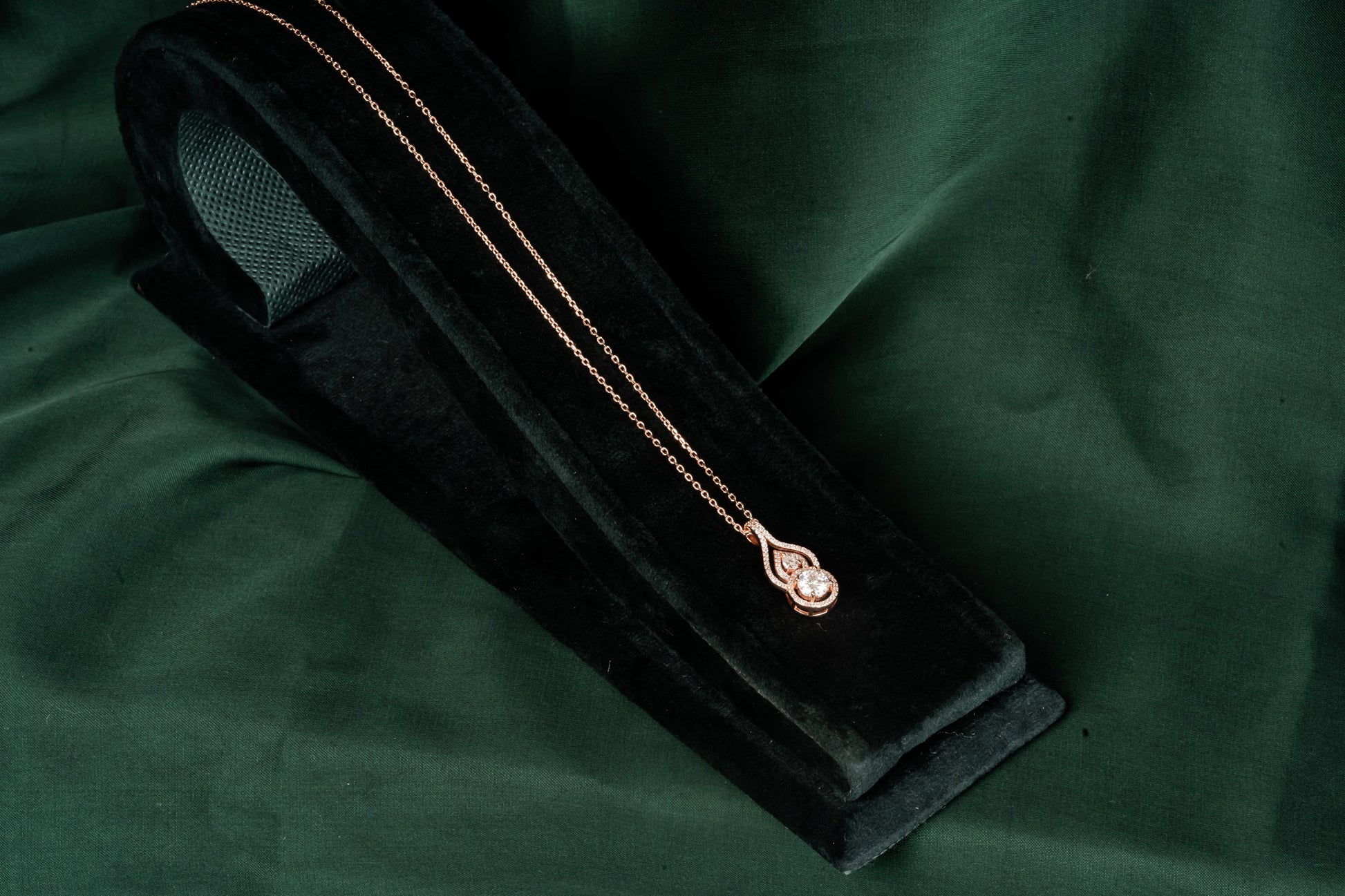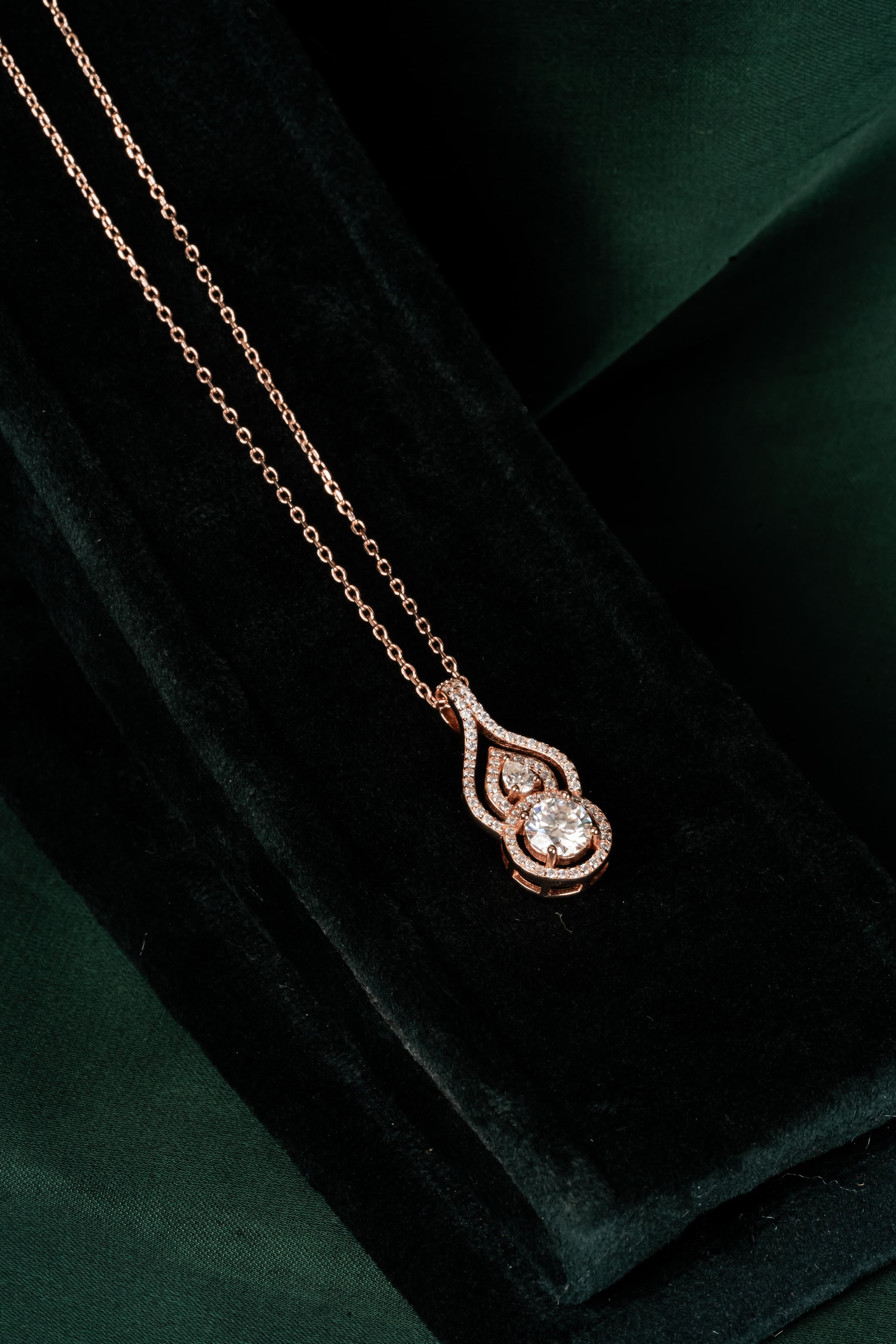 A round brilliant stone sits inside layered teardrop halos: three bands of Pave that create depth without bulk. The elongated shape flatters every neckline, the rose gold adds warmth against skin. Cocktail parties and conference dinners, when you want something substantial but not heavy.