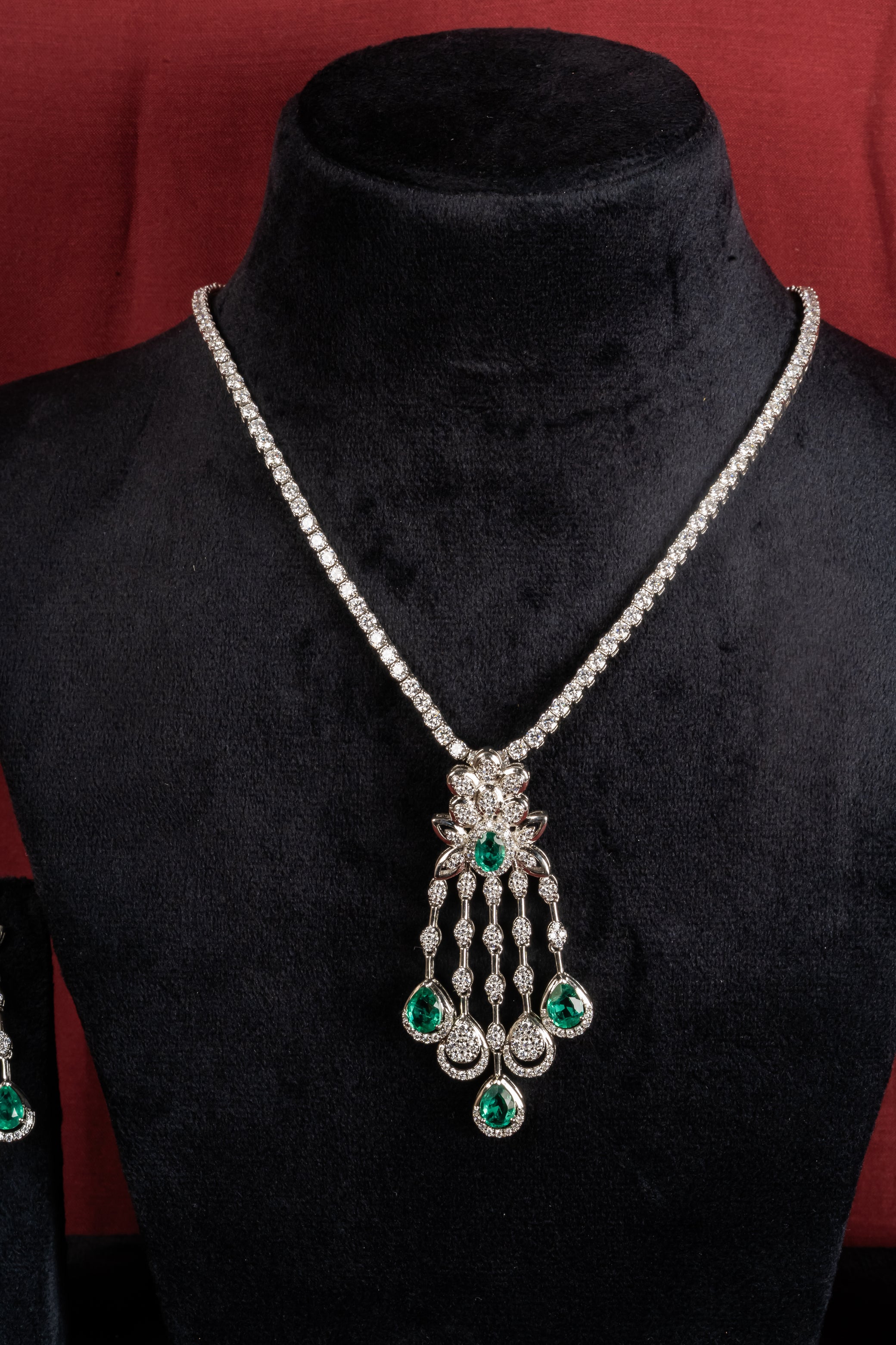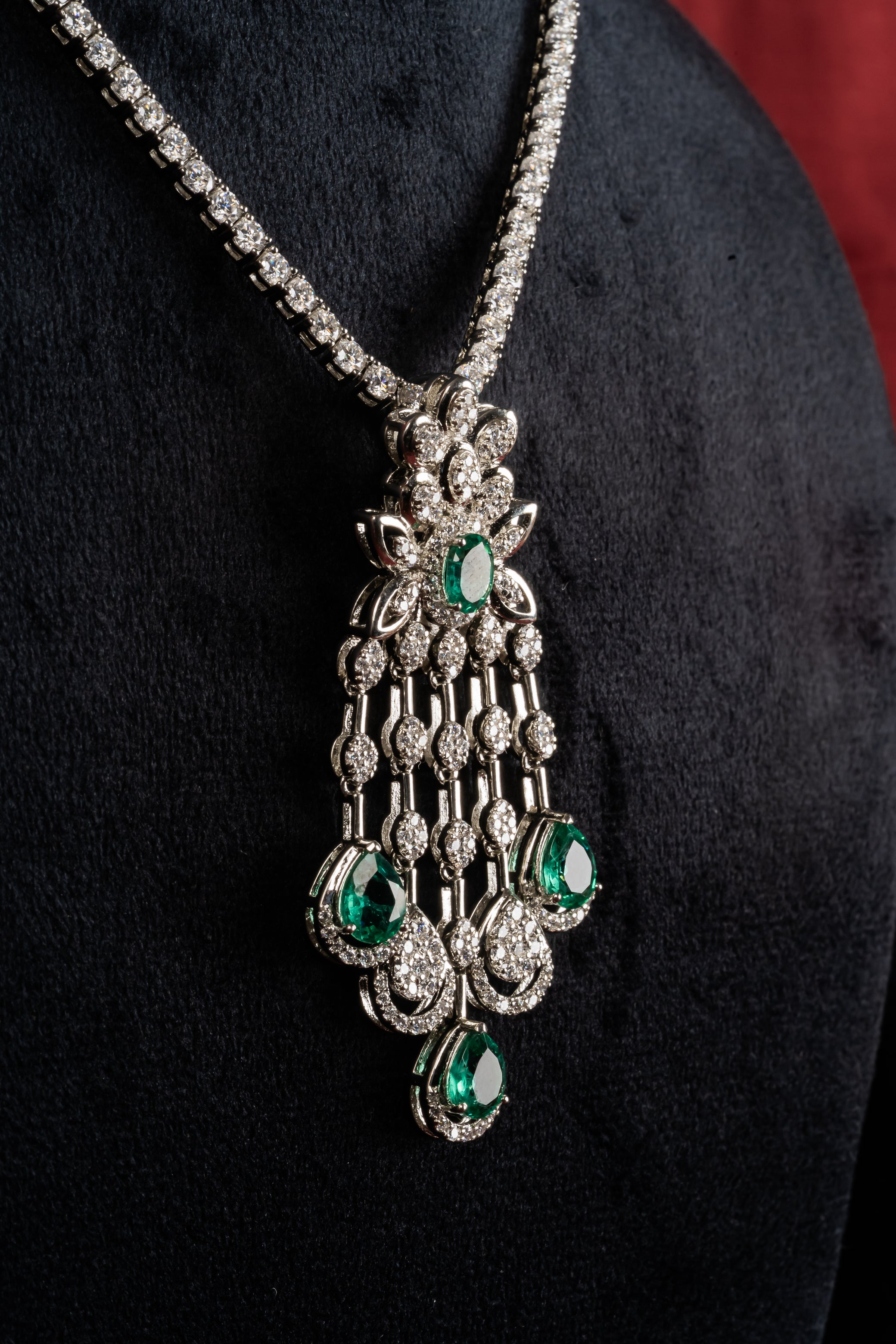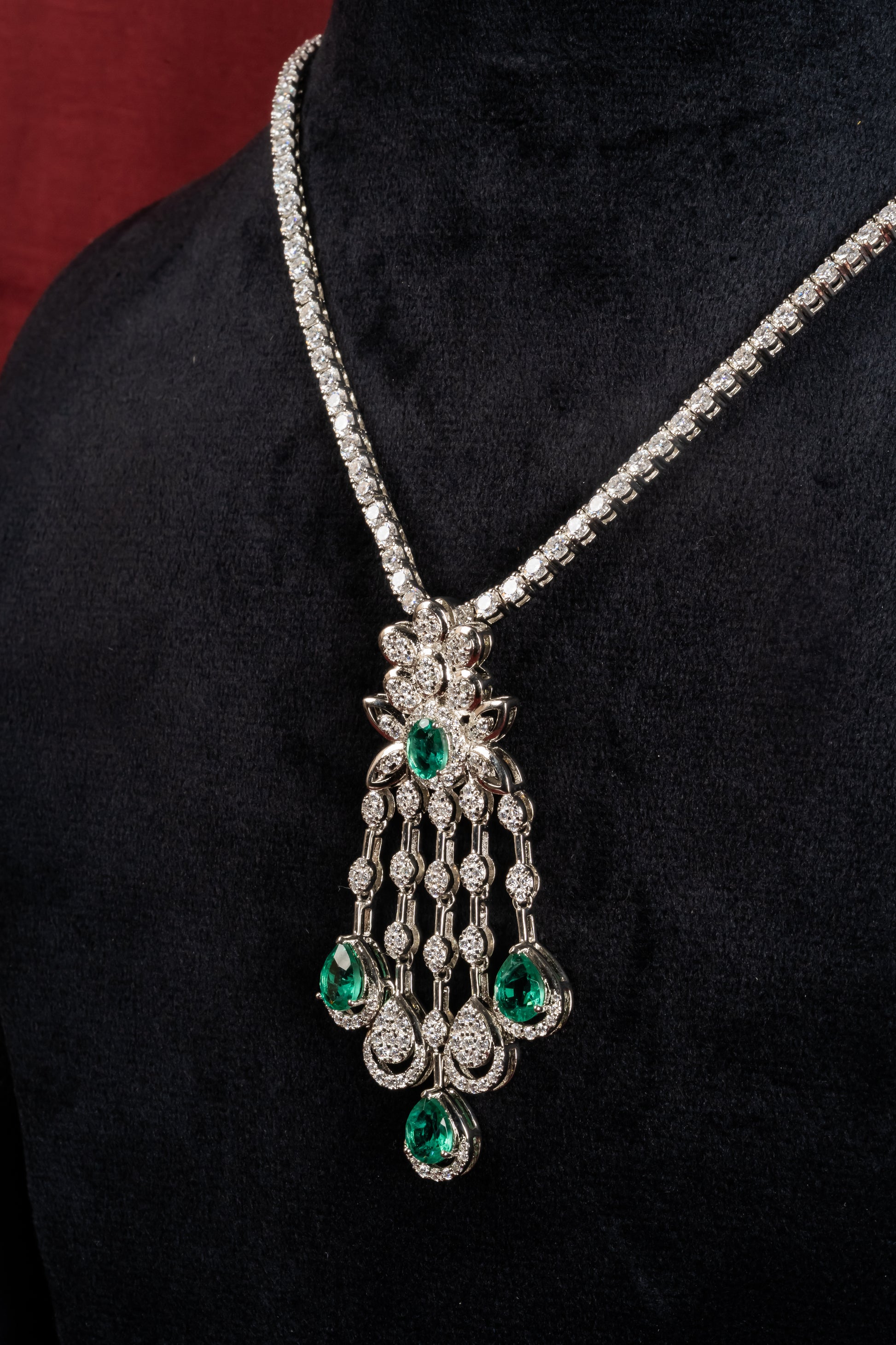 A cascading pendant with green drops anchored in a detailed top cluster, matched with coordinating earrings that mirror the fall. The movement is graceful and deliberate, designed to catch light with every step. Reach for it during sangeet nights, receptions, and milestone celebrations.