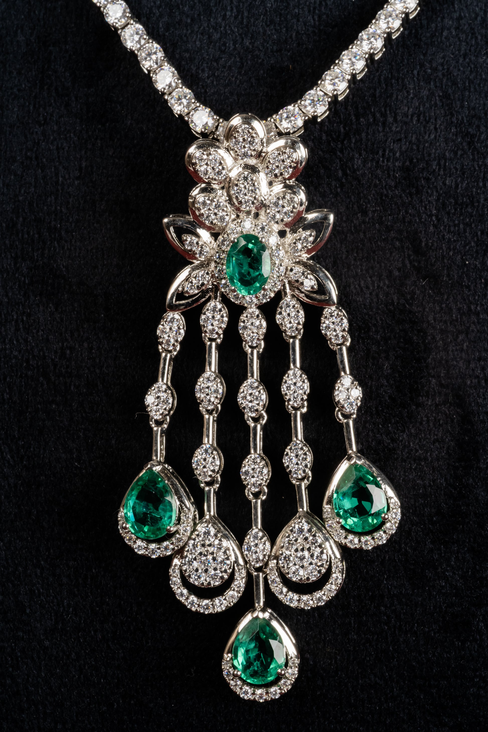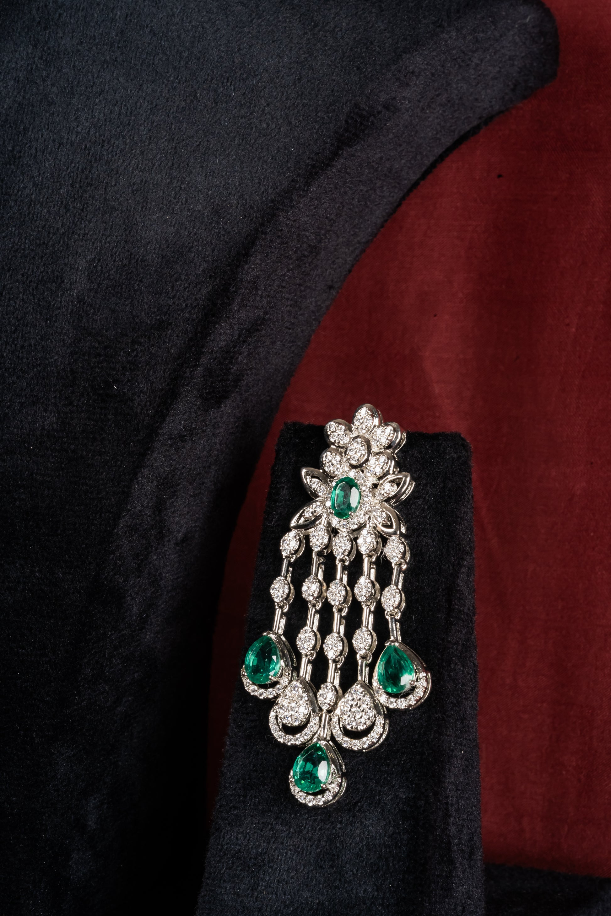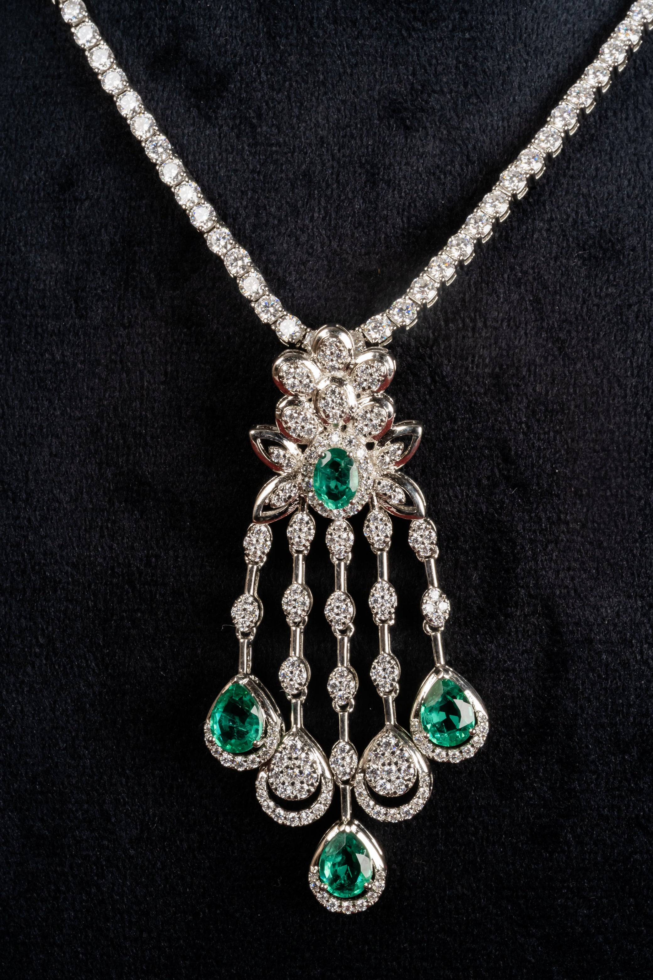 A cascading pendant with green drops anchored in a detailed top cluster, matched with coordinating earrings that mirror the fall. The movement is graceful and deliberate, designed to catch light with every step. Reach for it during sangeet nights, receptions, and milestone celebrations.