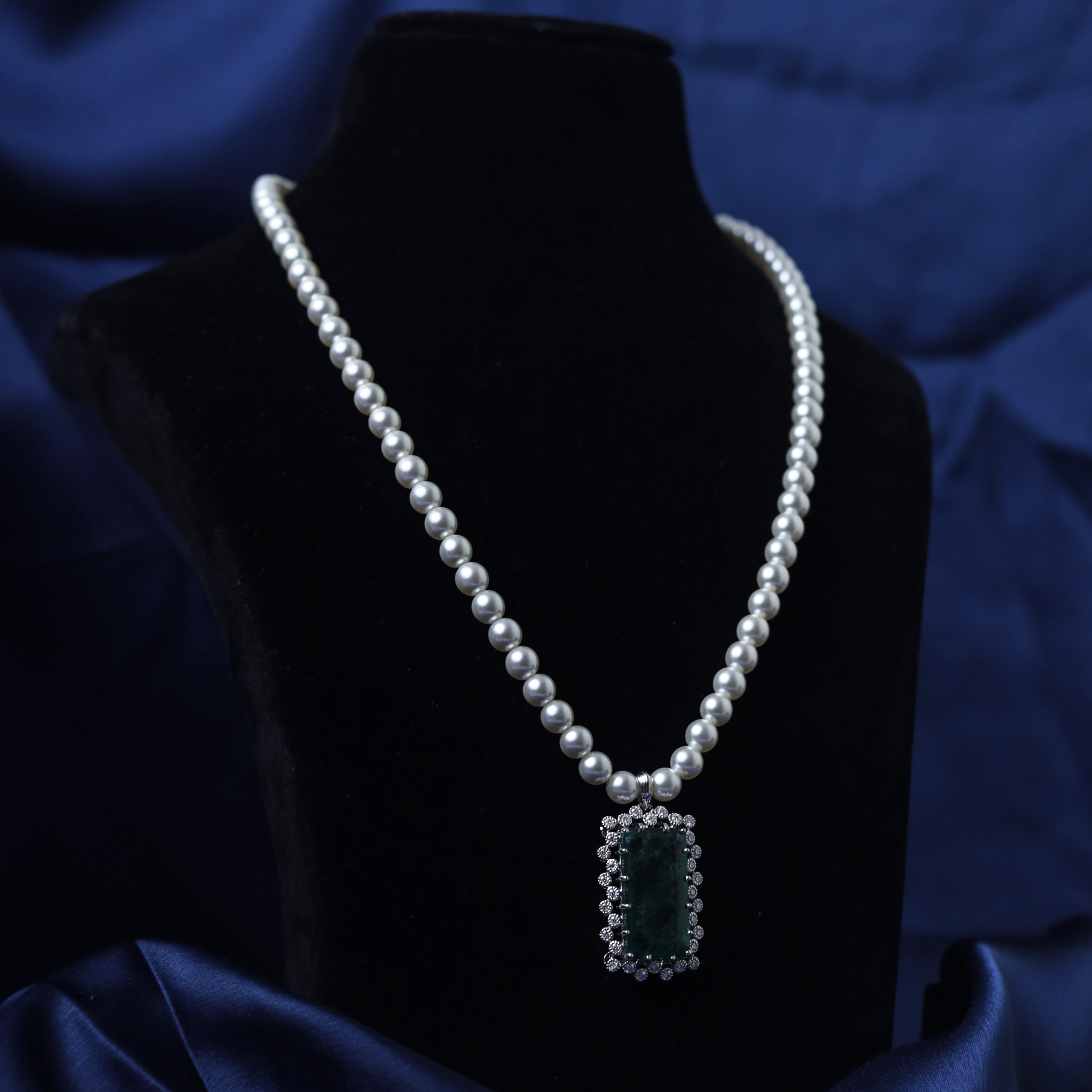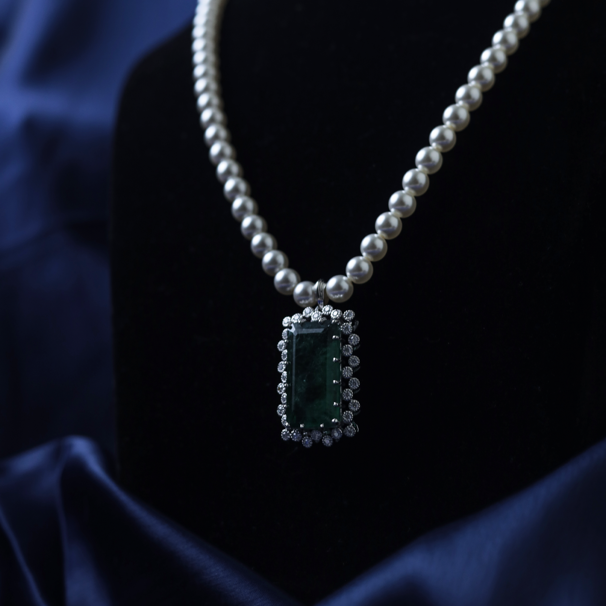 A study in contrast, this necklace pairs the soft, organic glow of pearls with the sharp, geometric precision of a statement pendant. The deep green core represents a steady heart amidst a sea of light. it's designed for the woman who values substance, feeling equally at home over a high-neck velvet gown or a crisp, white silk shirt for an evening event.