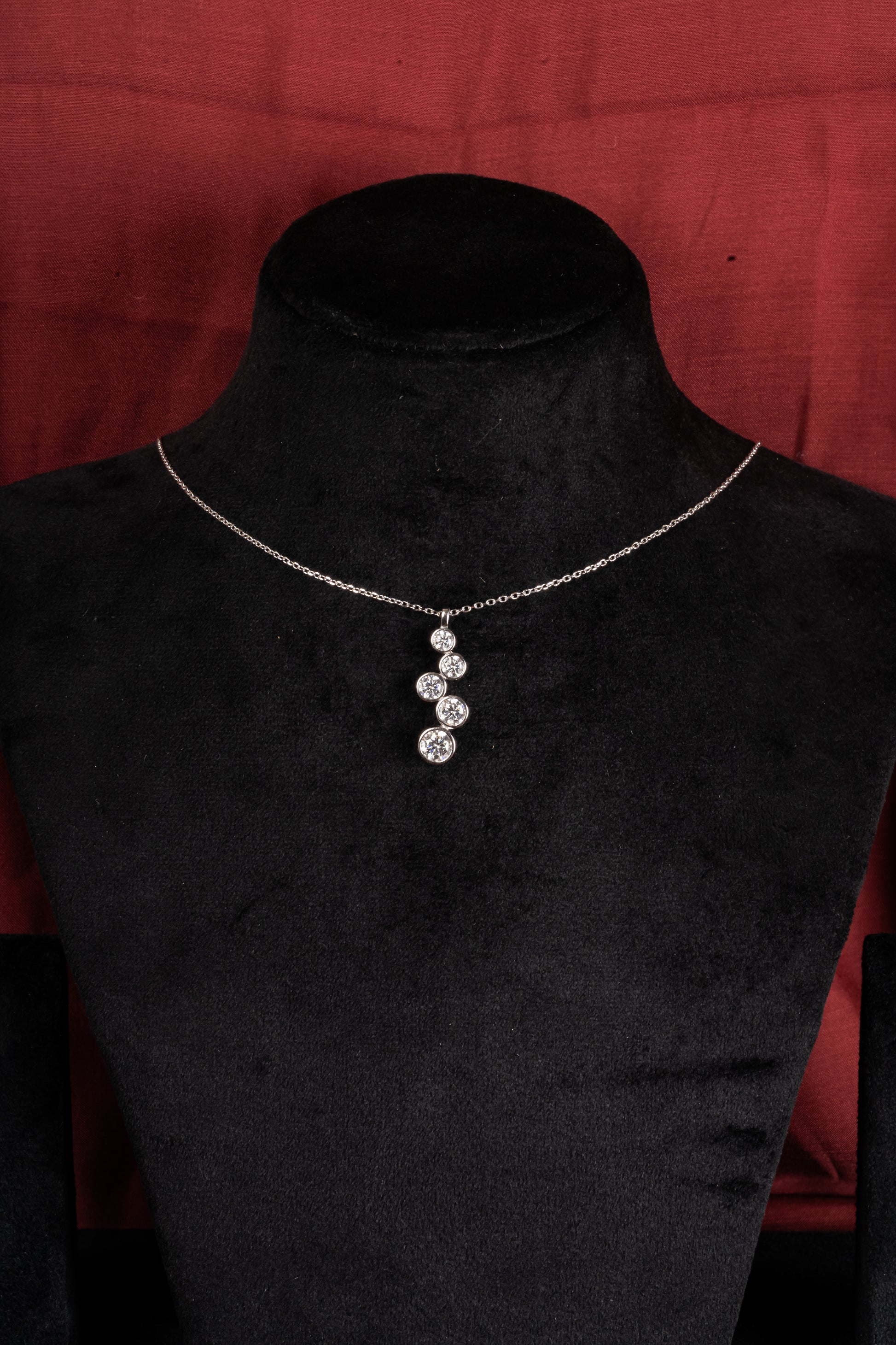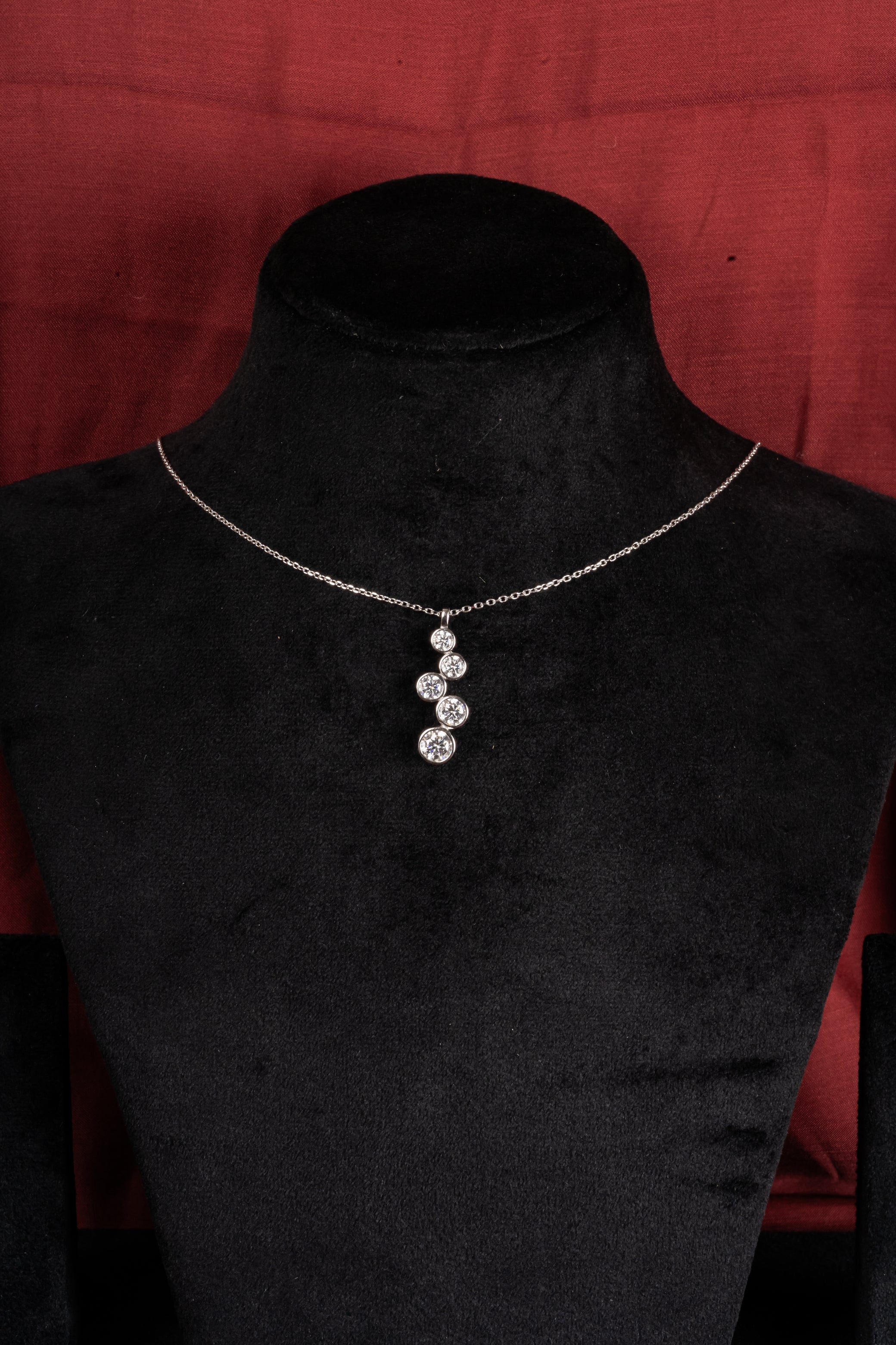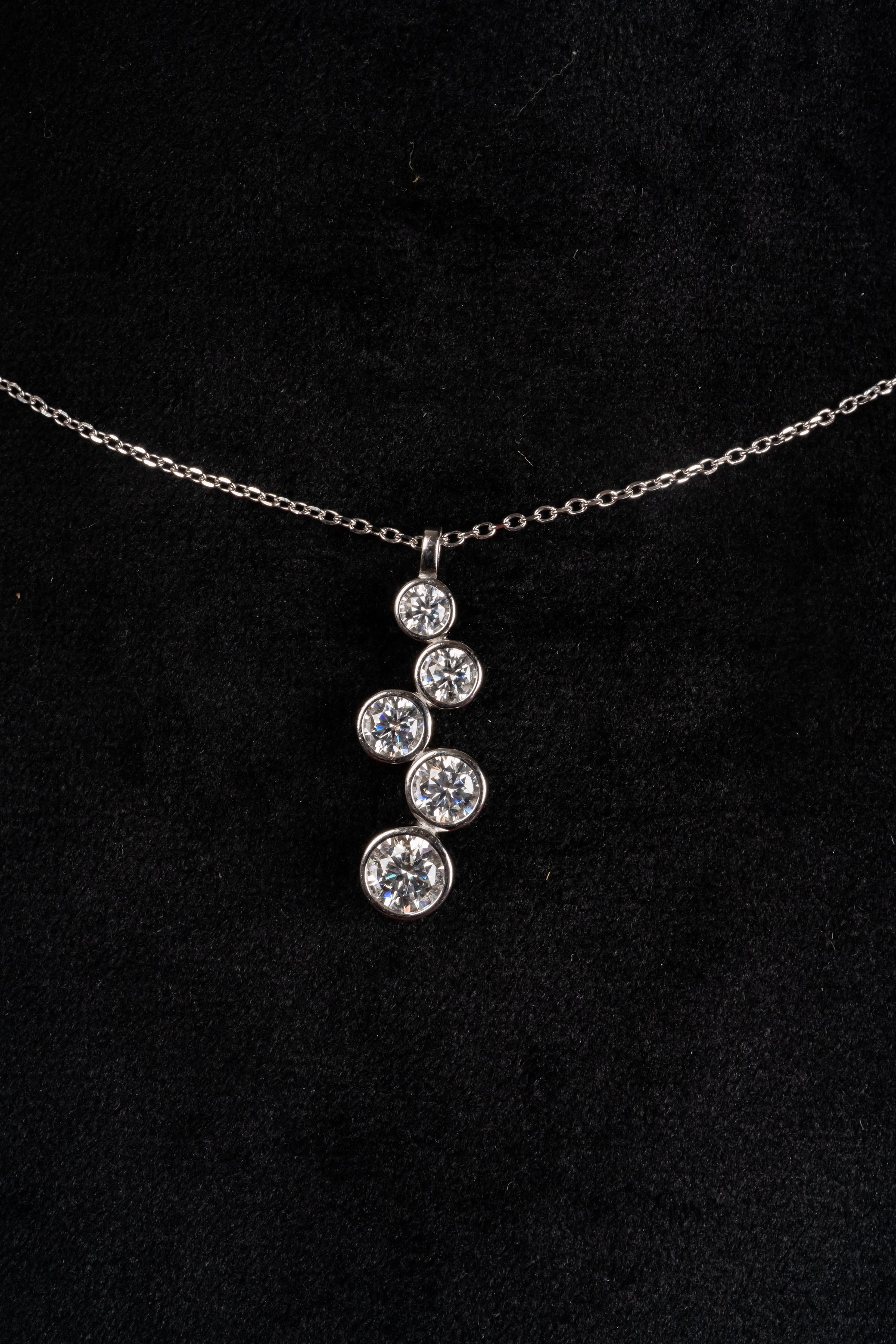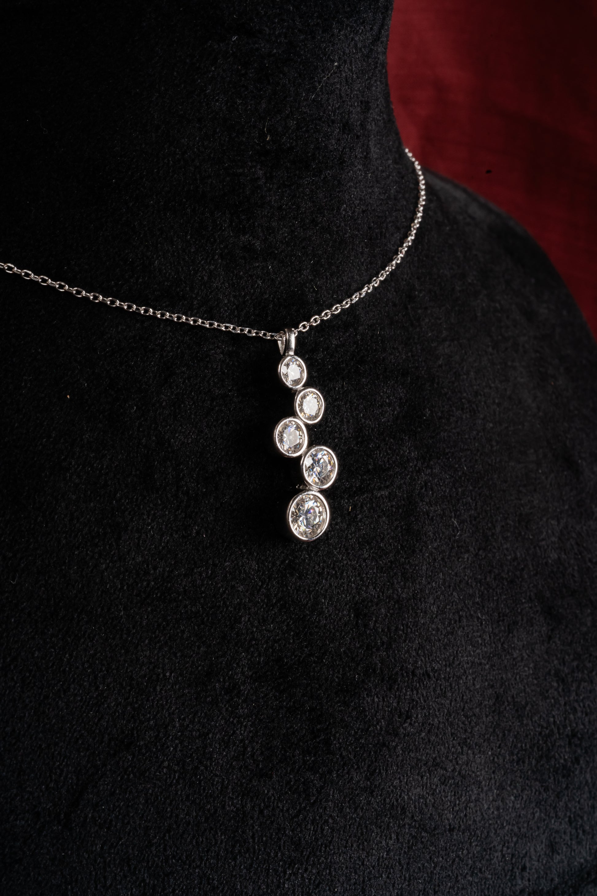 Five bezel-set stones placed in a gentle upward rhythm : like progress you can see. The vertical flow draws the eye, elongating the neckline in the most effortless way. It belongs in airport looks, office hours, and late dinners when you're building something of your own.